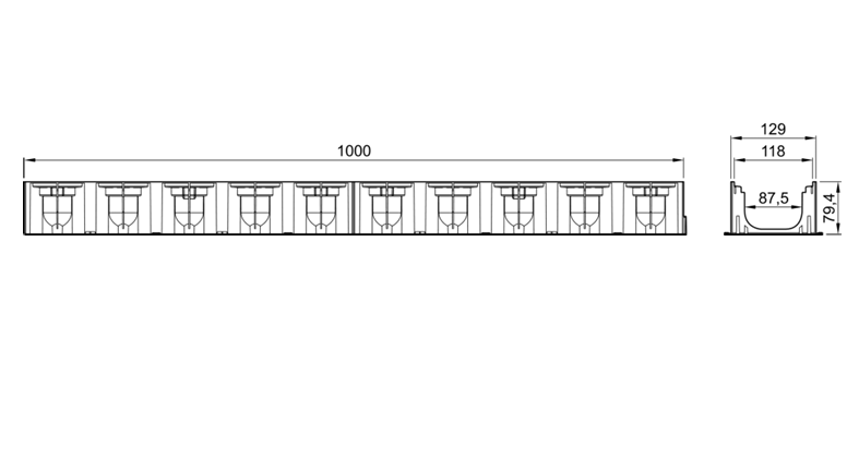 ACO HEXALINE linjedræn, afløbsrende 100 cm uden rist og udløb