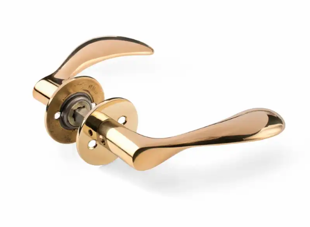 Dørgreb - AJ 111 - messing - Arne Jacobsen design. Med fastsiddende kuglelejerosetter. Leveres med tx10 pinolskruer og bøsningsskruer. Dørgreb med centerafstand 38 mm leveres også med styrebrik til trædøre.