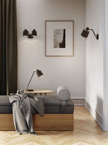 Elegant og hyggelig indendørs væglampe hvor traditionel stil har fået et moderne touch. En robust stilk sidder i den optimale vinkel til omgivende belysning, med et fuldt justerbart hoved til at rette lyset, når du fx skal sidde og læse.