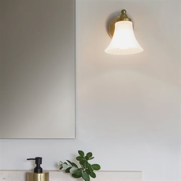 Smuk og klassisk væglampe med hvidt glas og blankpoleret krom. Er godkendt til vådrum, så fungerer rigtig godt til badeværelset.