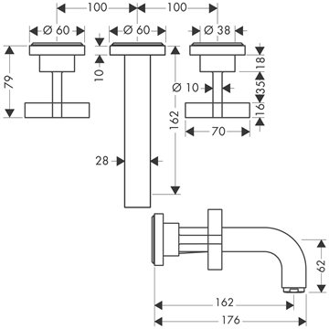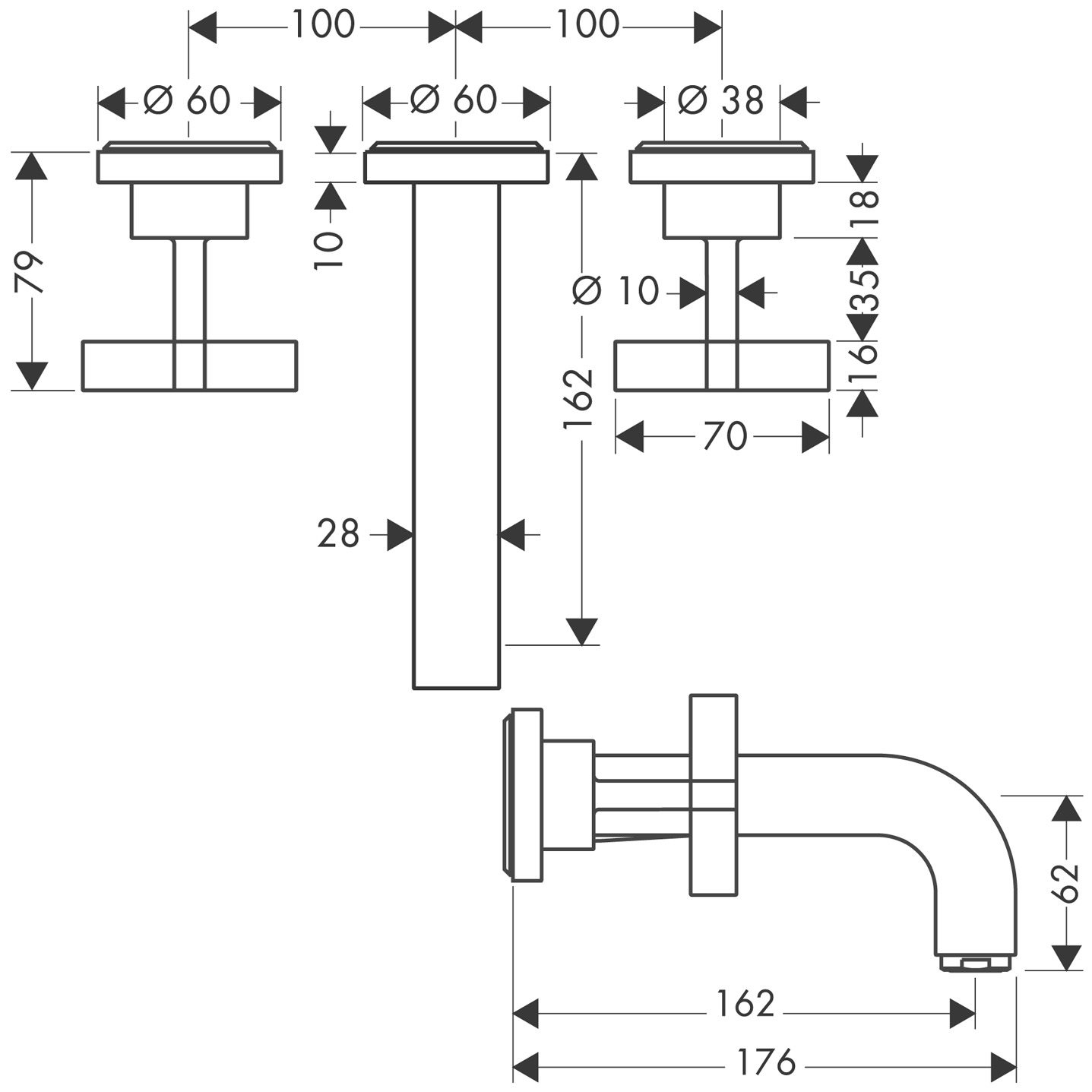 • består af: 3-huls håndvaskarmatur til vægmontering, bundventil