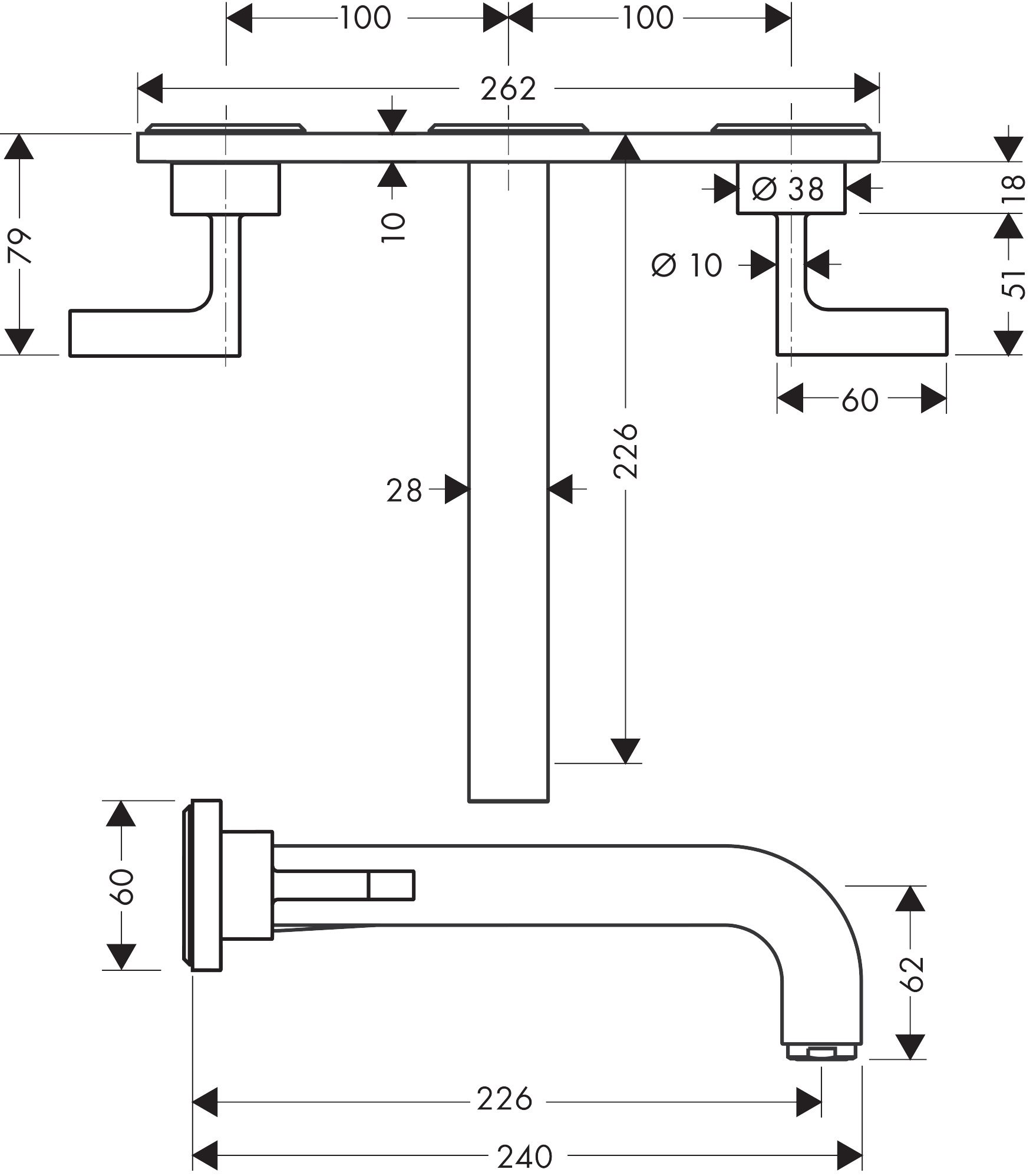 • består af: 3-huls håndvaskarmatur til vægmontering, bundventil