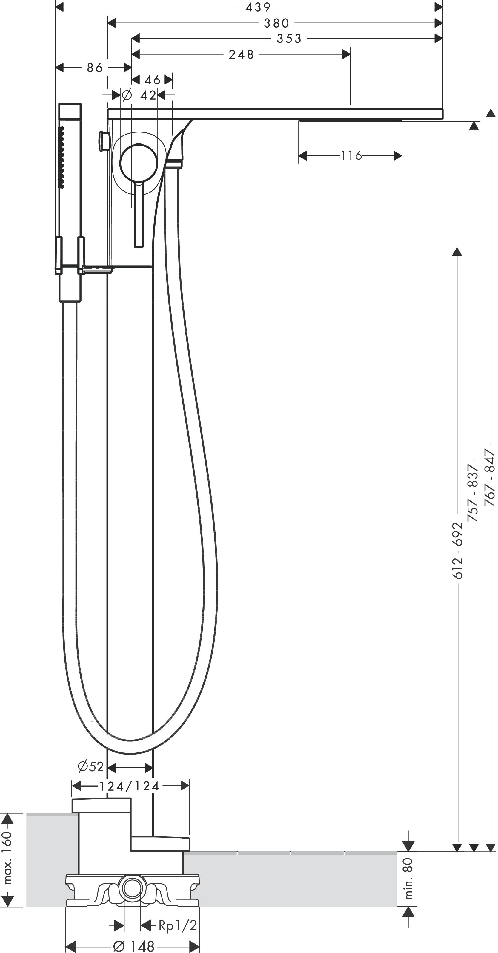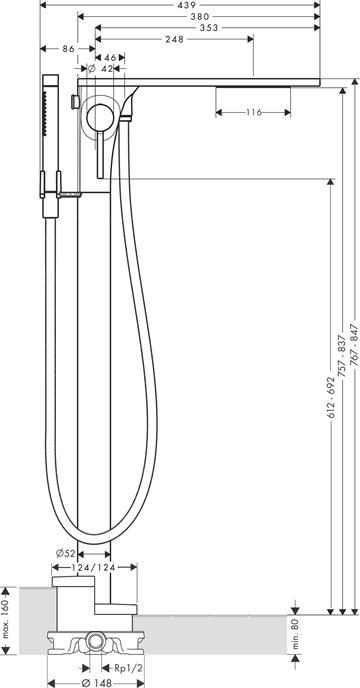består af: 1-grebs kararmatur til gulvmontering, stavhåndbruser, bruserslange, bruserholder