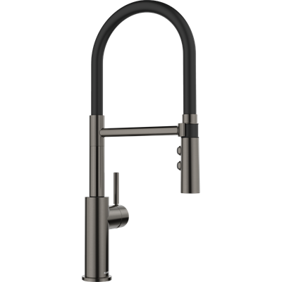 BLANCO Catris-S Flexo køkkenarmatur med stor afrundet tud i satin dark steel, der giver et klassisk og minimalistisk look. Indret dit køkken med dette flotte og klassiske køkkenvandhane fra BLANCO.