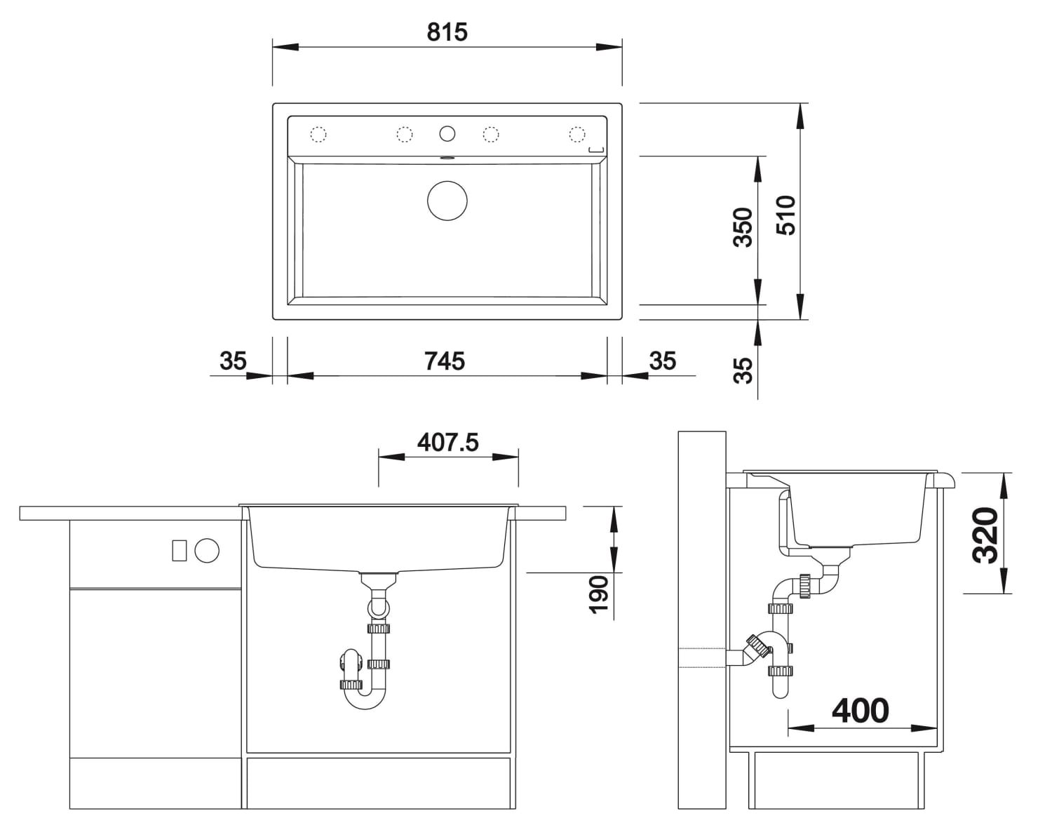 Blanco Dalago 8 F Køkkenvask 81,5x51 cm med hanehul samt kurveventil der betjenes på drejeknappen i SILGRANIT sort til planlimning - Hullet til drejeknappen er forboret, men ikke lavet.