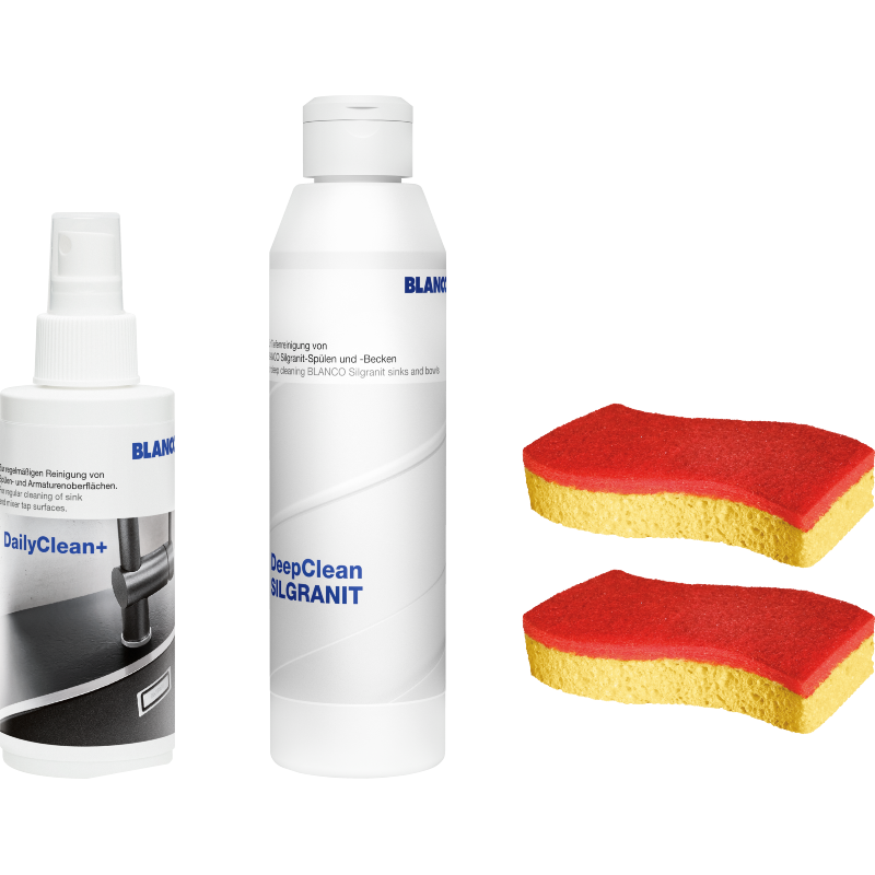 Sættet består af 1x BLANCO DailyClean+ 150 ml, 1x BLANCO DeepClean SILGRANIT à 250 ml og 2 Spontex svampe