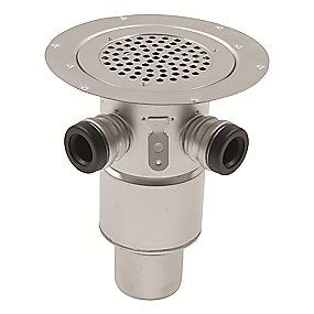 Rustfrit Blücher Circle gulvafløb med sideindløb og lodret Ø75 mm afløb.