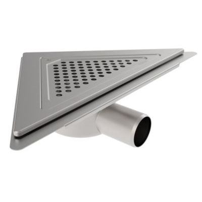 Blücher Trio gulvafløb med vandret Ø50 mm udløb, trekantet ramme samt smøremembran, Leveres med indbygningsvandlås. Til beton & fliser. Rustfrit stål