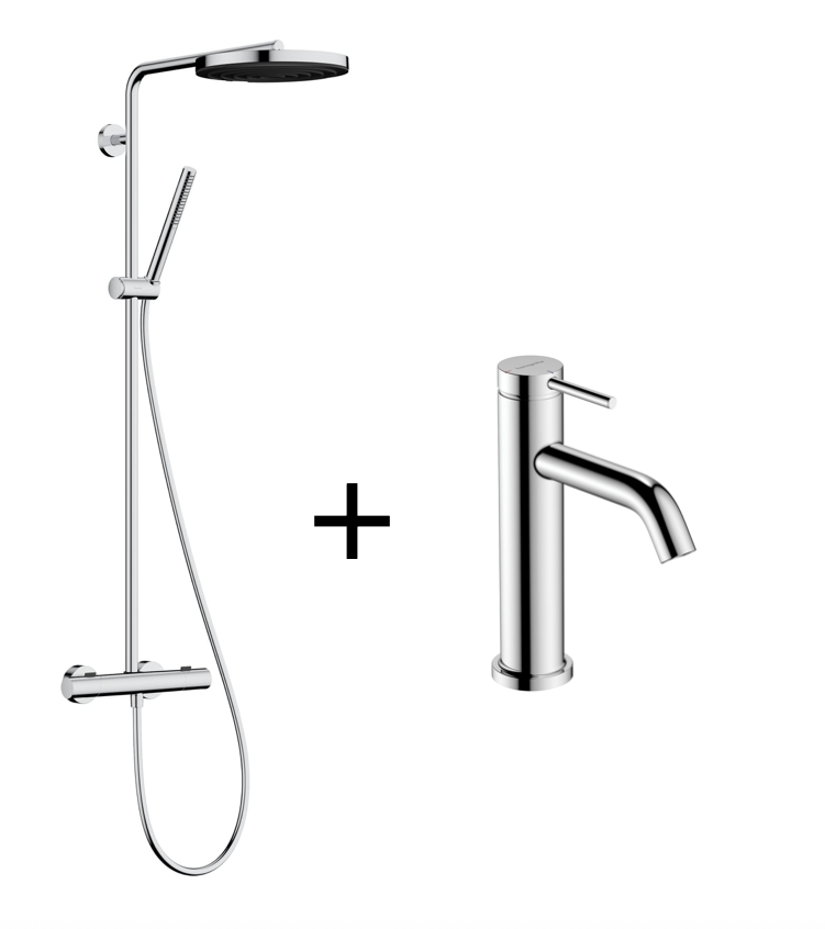 Komplet løsning: Med både håndvaskarmatur og brusesystem får du en fuldendt løsning til badeværelset.
