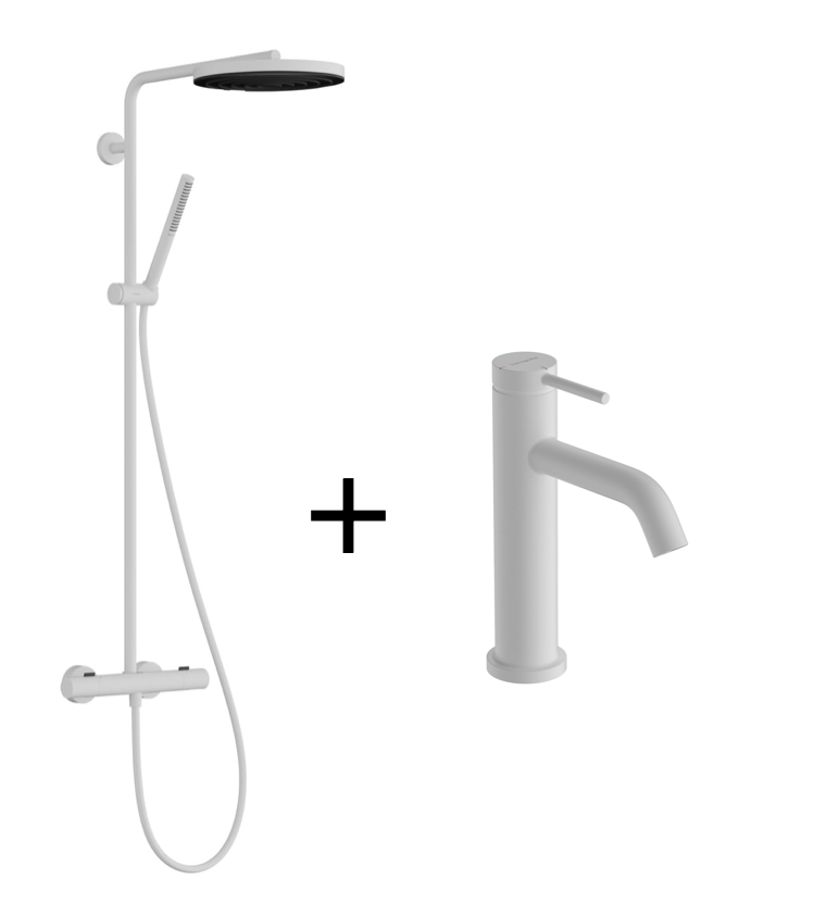 Komplet løsning: Med både håndvaskarmatur og brusesystem får du en fuldendt løsning til badeværelset.