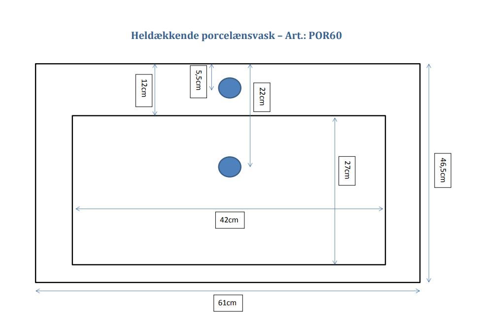 Cassøe porcelænsbordplade med integreret vask 61 x 46,5cm med overløb og hanehul