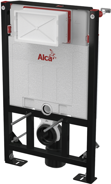Alca / Alcaplast AM101/850W Indbygningscisterne til hængetoilet leveres komplet med børstet messing dobbeltskyl betjening, en pulverlakeret ramme og en isoleret cisterne. Toiletskål og sæde er tilkøb.