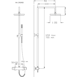 Højden på hovedbruseren kan indstilles mellem 705-1210 mm