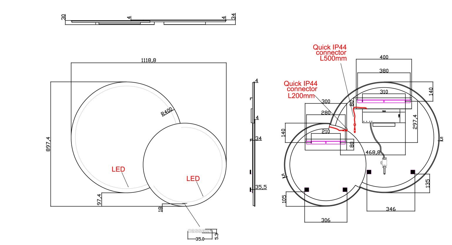 Cassøe Livorno Ø80 & 60cm rundt dobbeltspejl med backlight med lille spejl på højre side.