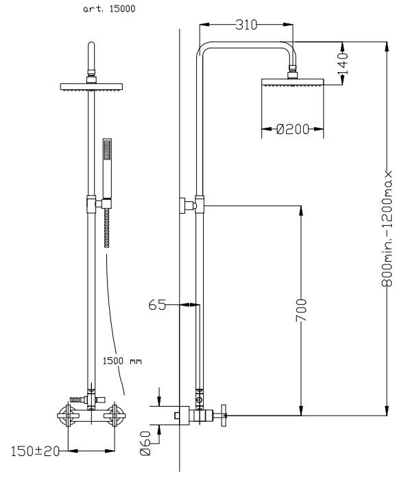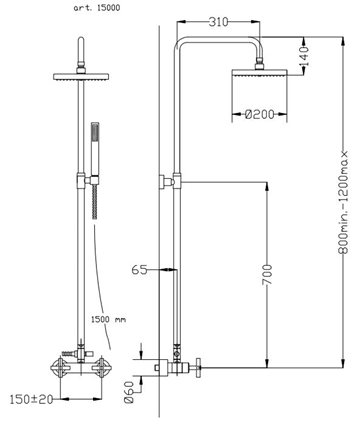 Komplet brusesæt med kold og varm greb, brusehoved Ø200 mm og håndbruser som billede. Håndbruseren er Højde justerbar.