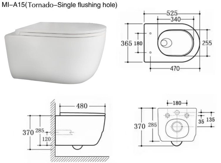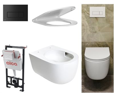 Komplet væghængt rimless toilet pakke med tornado skyl, 1120 mm cisterne med matsort skylleknap - pakken indeholder: