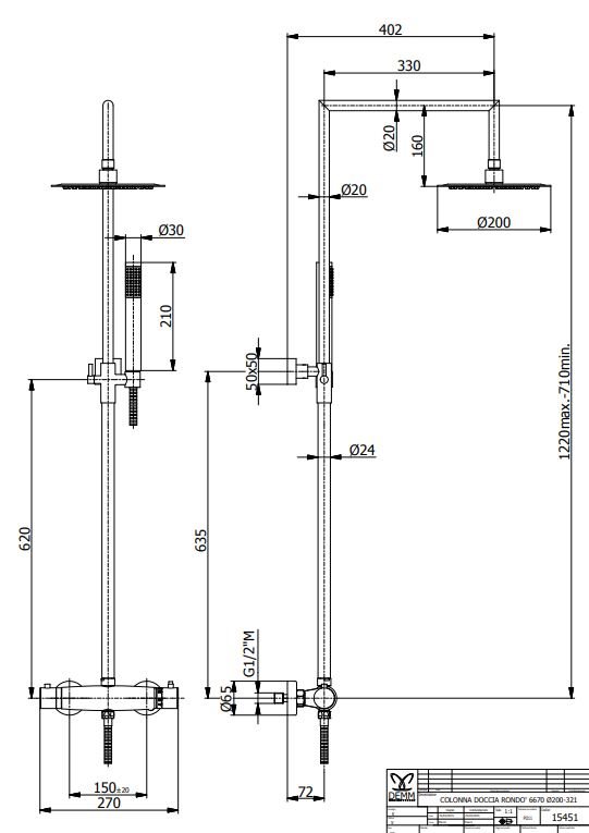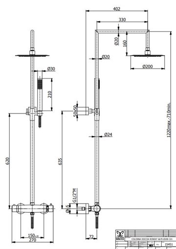 Den lodrette bruserstang er justerbar i højden fra min 71cm til max. 121 cm (Se stregtegningen for mere info).