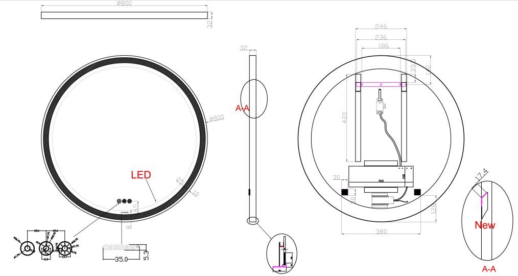 Dekorativt rundt spejl med sort ramme og frontlight samt touchpanel til tænd/sluk og dæmpbar lysstyrke, må ikke tilsluttes ekstern dæmper.