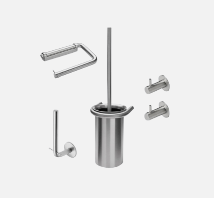 Sættet indeholder toiletrulleholder, reserverulleholder, toiletbørste og 2 stk. håndklædekroge.