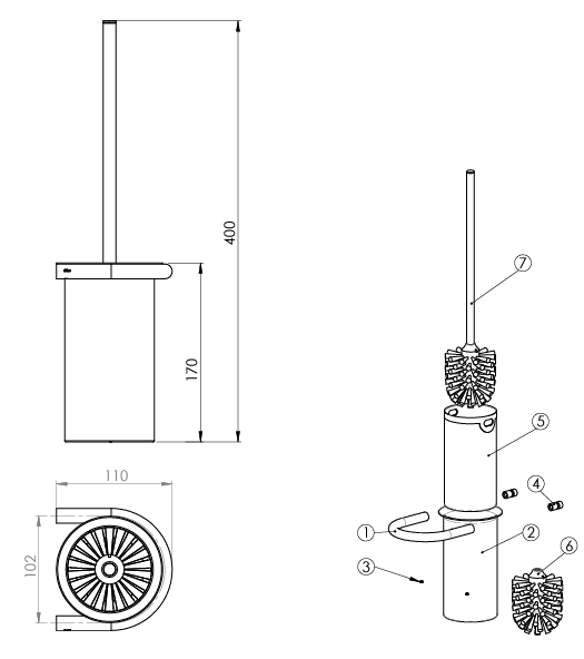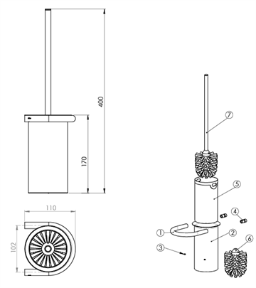 d line toiletbørste i rustfrit stål, slebet m/skål, holder & skaft