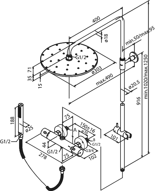 Inkl. 300 mm hovedbruser, håndbruser og slange Bruserslange i metal