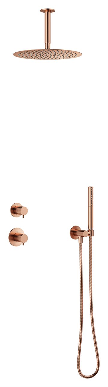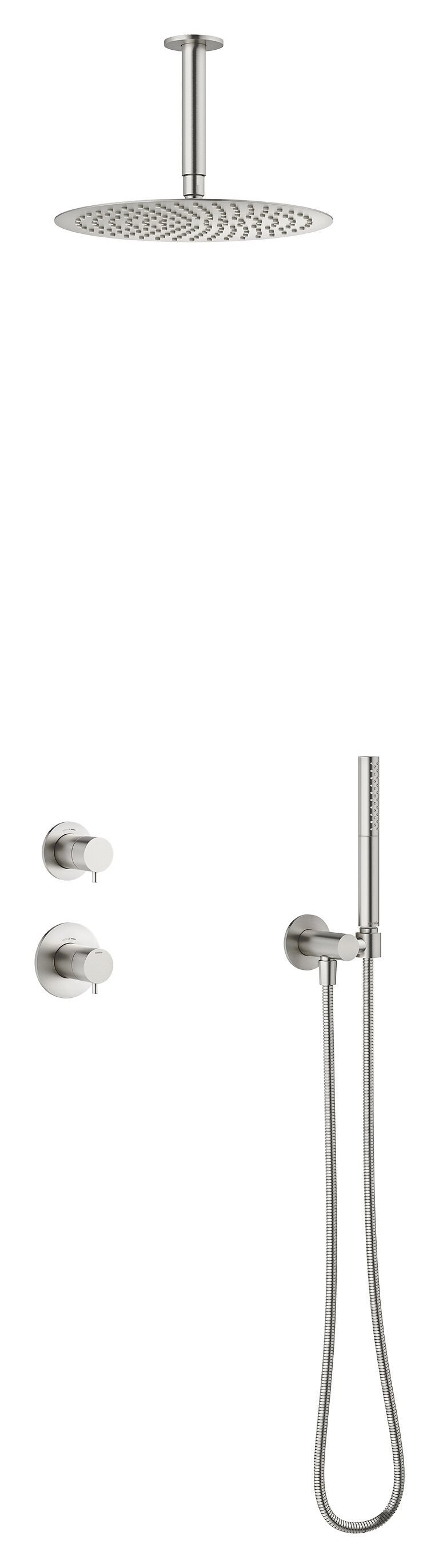 Damixa Iris DS 2 brusearmatur til indbygning – Ø300 mm slim loftmonteret hovedbruser og 3-spray stavhåndbruser