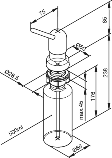 Damixa dispenser for opvaskemiddel eller plejemiddel med 75mm dyse og 500ml beholder.
