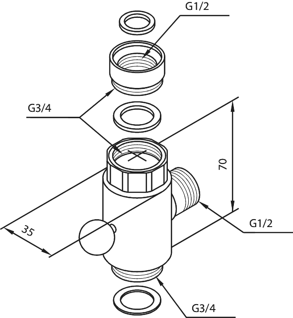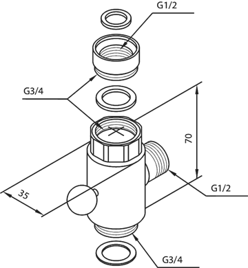 • Løs omskifter medfølger 1/2'' & 3/4'' omløber, 3/4'' studs til svingtud, 1/2'' studs for slange.