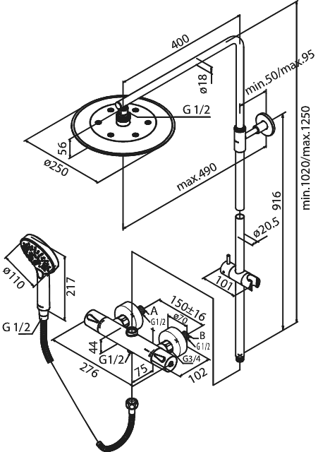 Damixa Silhouet komplet brusearmatur med termostat blandingsbatteri i matsort med stort Ø250 mm hovedbruser og håndbruser i Ø110 mm. Både hoved- og håndbruser er med Rub Clean, som gør det nemt at fjerne kalk fra dyserne uden værktøj og kemikalier. Gnub med en finger på den fleksible gummioverflade for at fjerne kalkaflejringerne.