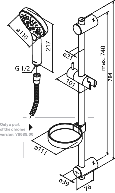 - Håndbruser Ø110 mm med 3 indstillingsmuligheder. Og Rub Clean der gør det nemt at fjerne kalk.