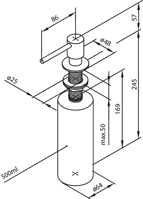 Damixa SILHOUET Sæbedispenser i krom med 500 ml beholder. Passer i et standard hanehul på mellem Ø26 og Ø36 mm
