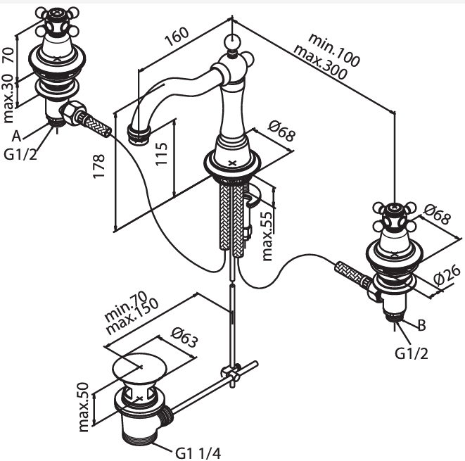 Tradition 3-hulsbatteri m/ 160 mm fast tud. Med bundventil. (vvs nr.: 702739604)