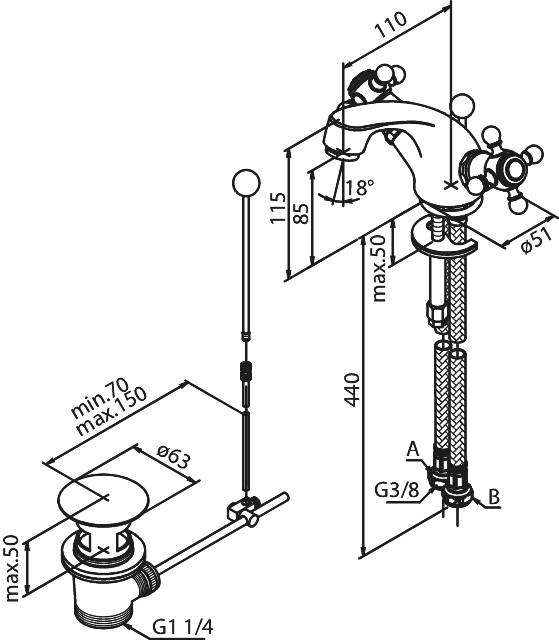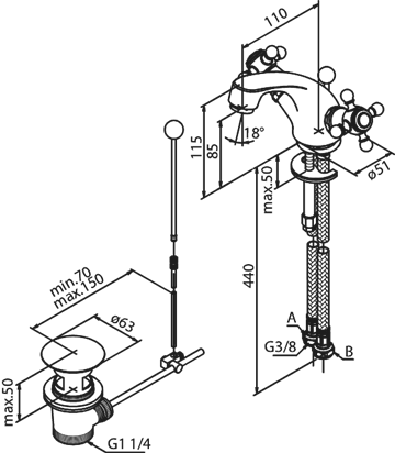 Damixa Tradition håndvaskbatteri 110mm tud og løft-op bundventil i krom