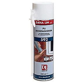 1-komponent polyurethanskum klar til brug. Produktet kan anvendes ved montering af døre og vinduer, isolering og lyddæmpning, udfyldning af mindre huller og hulrum, samt til tætning af brøndringe og kloakrør. Dana Lim PU Montageskum 592 binder og isolerer fortræffeligt. Hæfter på de fleste byggematerialer (dog ikke polyethylen, teflon, silicone og lignende limafvisende flader). Vær opmærksom på at PU-skum ikke tåler sollys (UV-lys), og derfor altid skal dækkes/overmales. Indeholder ikke CFC, HFC eller HCFC drivmidler.