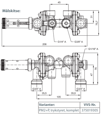 PM2+P, trykstyret brugsvandsregulator er med integreret trykdifferensregulator. Brugsvandsregulatoren anvendes til styring af varmtvandstemperaturen i Danfoss Redan produktserien Akva Vita II og Akva Les.