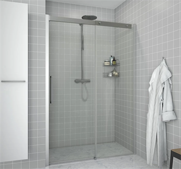 Dansani Air – Brusedøre og afskærmninger i et minimalistisk design. De diskrete massivt forkromet messing hængsler holder de 8 mm hærdede sikkerhedsglasplader sammen.