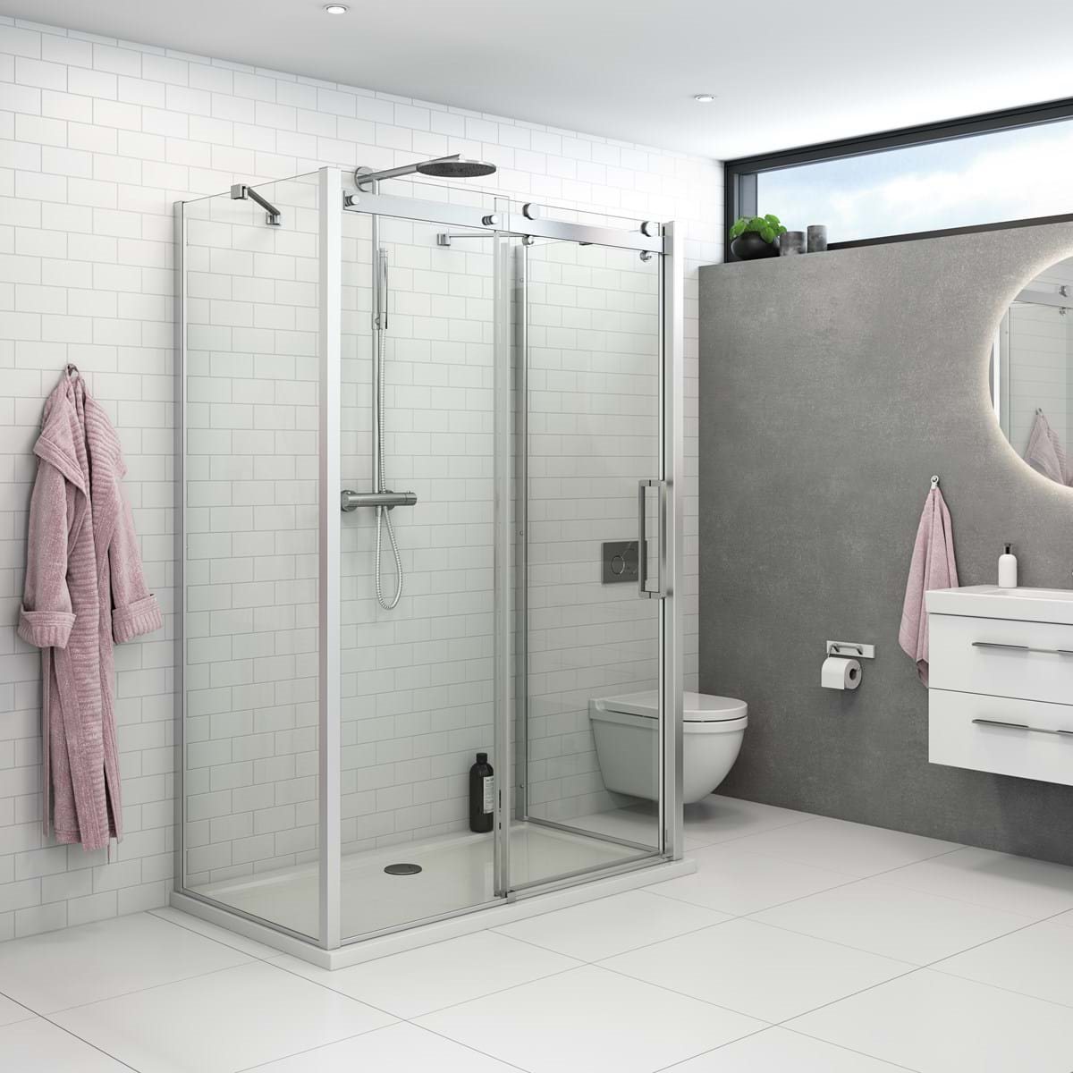 Denne skydedør bruseløsning har 8 mm hærdet sikkerhedsglas, som indvendigt har fået en Easy Carebehandling for nem rengøring og vedligeholdelse.