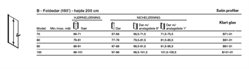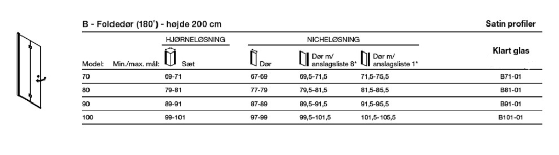 Dansani Match Foldedør i klart glas - 87-89 cm - B91-01 er en del af Dansani Match Serien, der består af en bred serie af bruseløsninger som leveres i mange størrelser, der i kombination med hinanden kan sammensættes til fx hjørneløsninger enten med to svingdøre eller med foldedøre eller med sidepaneler samt svingdøre.