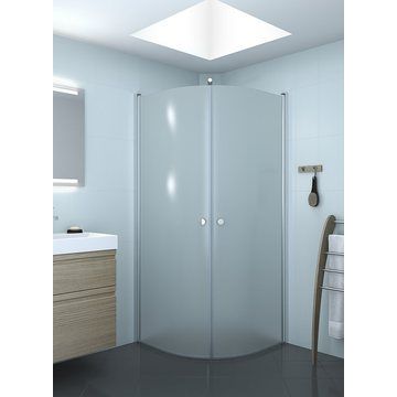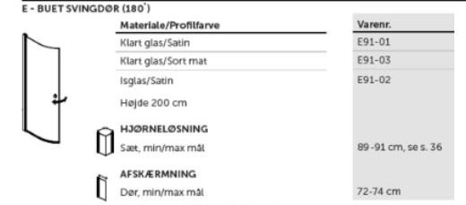 Match E bruseafskærmning /isglas/90 cmBruseafskærmning med halvrund svingdør* 10 års garanti mod fabrikationsfejl* 6 mm hærdet sikkerhedsglas* Hæve/sænke funktion* Døråbning både ind og ud* Justerbar (udvendig side af profil)* Højde 200 cm* Belagt med EasyCare behandling på indvendig side