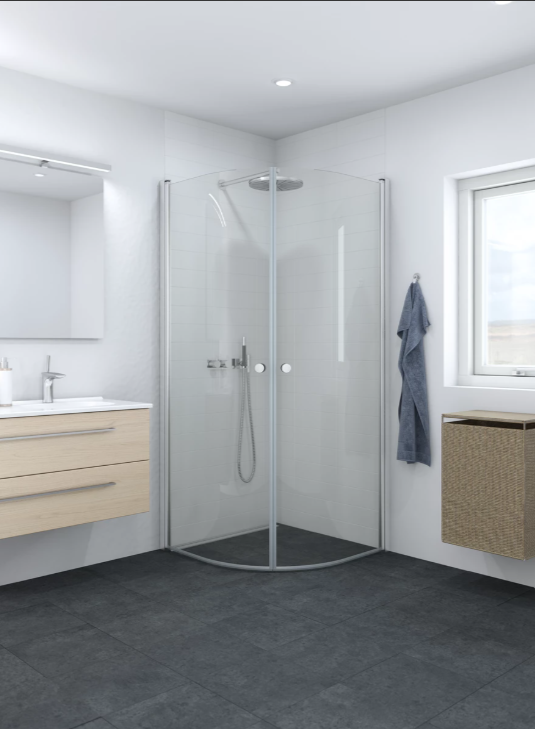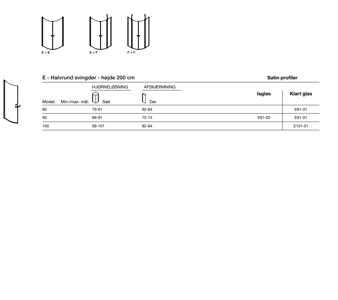 Dansani Match E halvrund svingdør er en del af Dansani Match Serien, der består af en bred serie af bruseløsninger som leveres i mange størrelser, der i kombination med hinanden kan sammensættes til fx hjørneløsninger enten med to svingdøre eller med foldedøre eller med sidepaneler samt svingdøre.