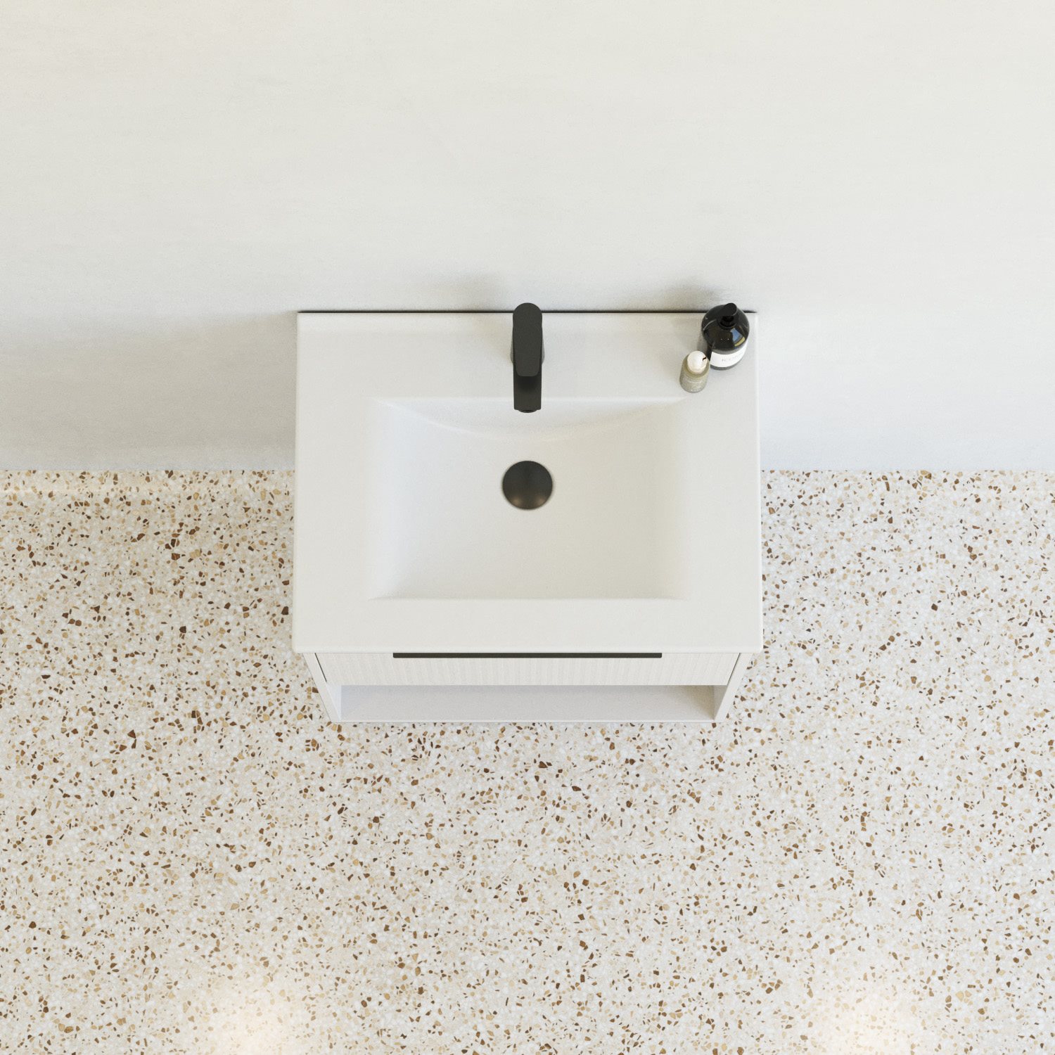 Den stribet front på badeværelsesmøblet tilføjer dynamik og tekstur, hvilket kan give rummet et mere eksklusivt og moderne udtryk. Strukturen bryder ensartede flader og tilfører dybde, hvilket gør møblet til et stilfuldt fokuspunkt i badeværelset.