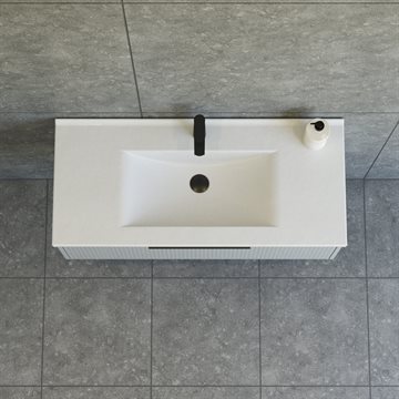Den stribet front på badeværelsesmøblet tilføjer dynamik og tekstur, hvilket kan give rummet et mere eksklusivt og moderne udtryk. Strukturen bryder ensartede flader og tilfører dybde, hvilket gør møblet til et stilfuldt fokuspunkt i badeværelset.