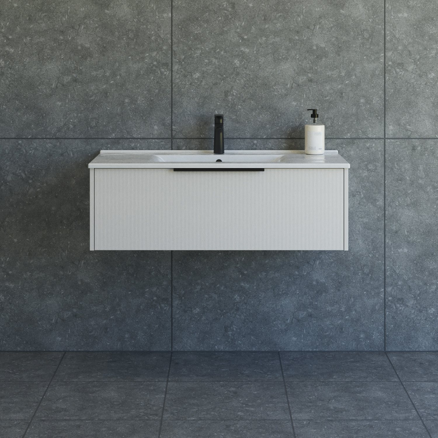 Den stribet front på badeværelsesmøblet tilføjer dynamik og tekstur, hvilket kan give rummet et mere eksklusivt og moderne udtryk. Strukturen bryder ensartede flader og tilfører dybde, hvilket gør møblet til et stilfuldt fokuspunkt i badeværelset.