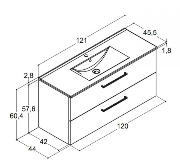 Dansani Mido+ møbelpakke 121cm med Amber håndvask og 2 soft close skuffer og greb, Hvid mat - art.nr. MMA-2610