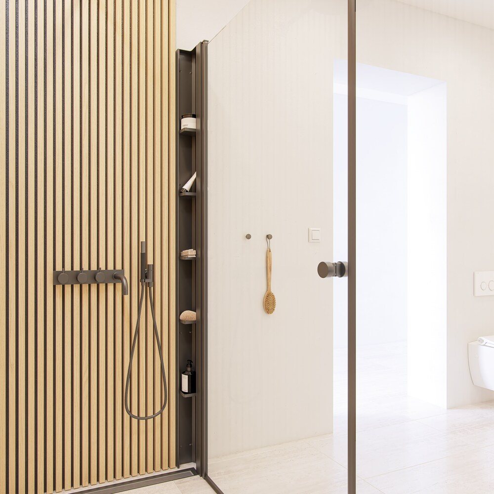 Eksklusiv og sofistikeret brusereol med fem smukt udformede hylder, der let kombineres med Match brusedøre. Den tilføjer en luksuriøs atmosfære til dit badeværelse og holder elegant styr på din samling af shampoo, sæbe og alle dine badeværelsesessentials.