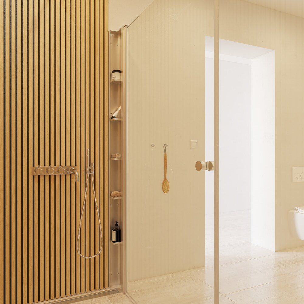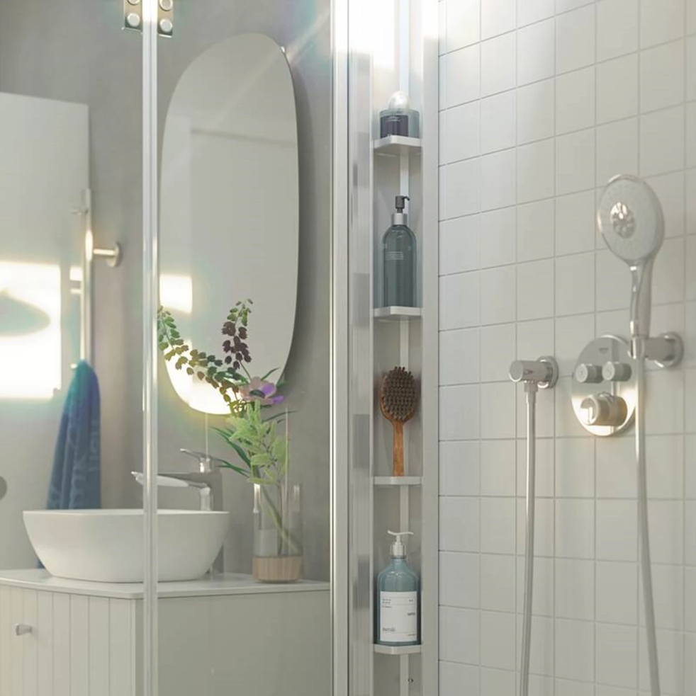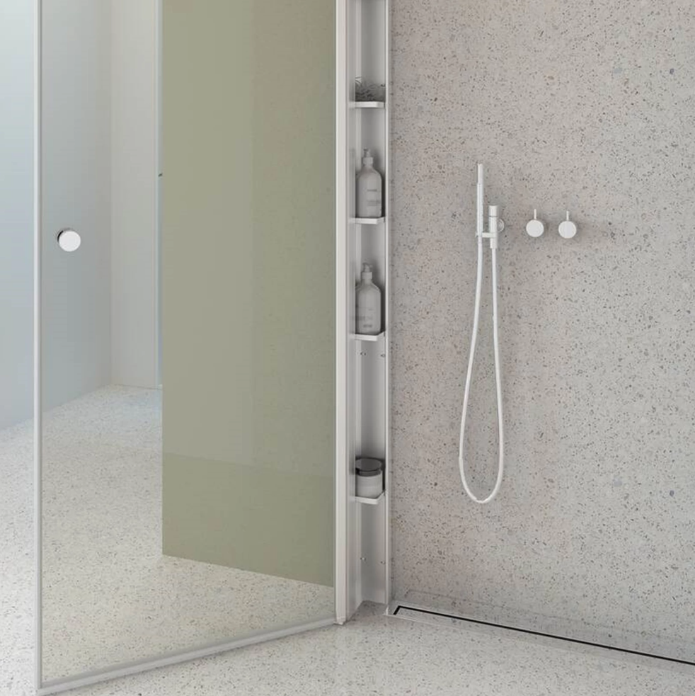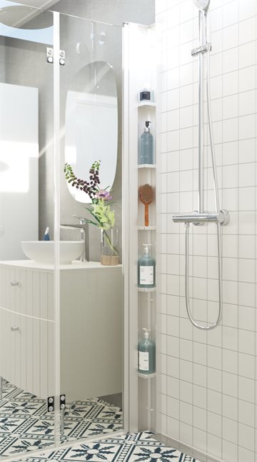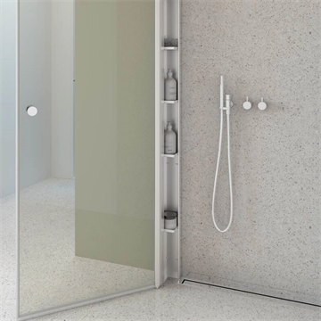 Eksklusiv og sofistikeret brusereol med fem smukt udformede hylder, der let kombineres med Match brusedøre. Den tilføjer en luksuriøs atmosfære til dit badeværelse og holder elegant styr på din samling af shampoo, sæbe og alle dine badeværelsesessentials.
