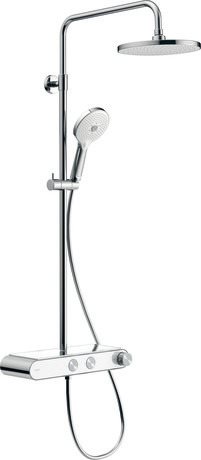 Brusetermostat, Krom, Hvid Højglans, Højde: 940 mm, Højdejusterbar håndbruseholder: højde justerbar, Inkl. bruseslange, Længde på bruseslange: 1600 mm, Inkl. håndbruser, Inkl. hovedbruser, Diameter hovedbruser: 230 mm, Hovedbruser vinkeljusterbar, Svingbar, Tilslutningsstørrelse: DN 15, Tilslutningstype/Vandtilslutning: S-tilslutning, Dimension slangetilslutning: 1/2 told, Skoldningssikring (38 °C), Termostatkartusche, anbefalet driftstryk: 1 - 5 bar, Gennemstrømningsmængde håndbruser (3 bar): 9 l/min, Gennemstrømningsmængde hovedbruser (3 bar): 9 l/min, Tilbageløbssikring i slangeforbindelsen, Centerafstand: 150 mm ± 12 mm