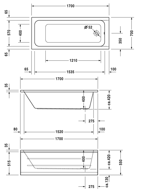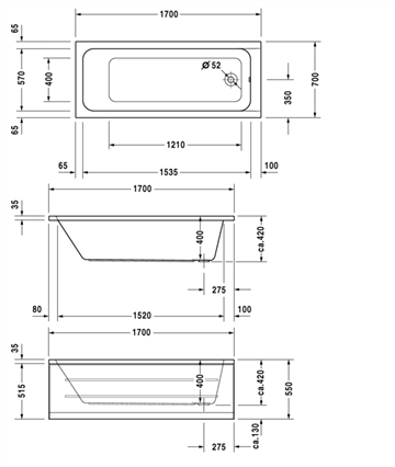 Duravit D-code kar indbygning 170 x 70 cm med afløb i fodenden