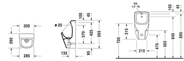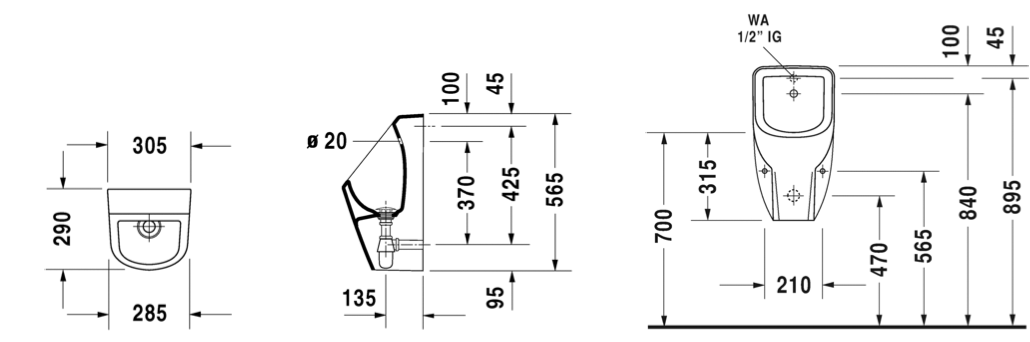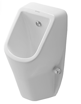 Duravit D-Code urinal vandtilslutning bagfra. Åben skyllerand. Hvid