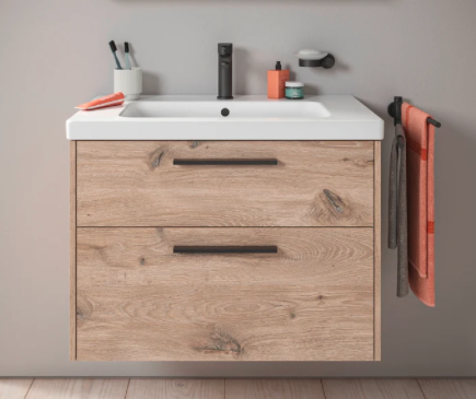 Underskabet måler 78,4 cm i bredden og 46 cm i dybden og giver god opbevaringsplads til alt fra håndklæder til hverdagens små nødvendigheder. De to rummelige skuffer er udstyret med soft close, så de lukker blidt og lydløst – selv når tempoet er højt i hverdagen.